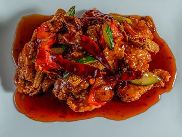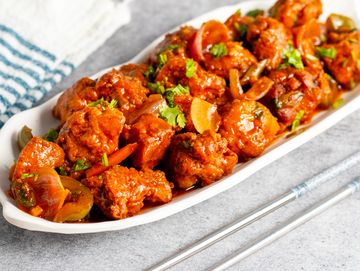 Crispy fried chicken strips tossed in a spicy Indo-Chinese sauce with bell peppers, garlic, and spring onions — bold, fiery, and flavorful.