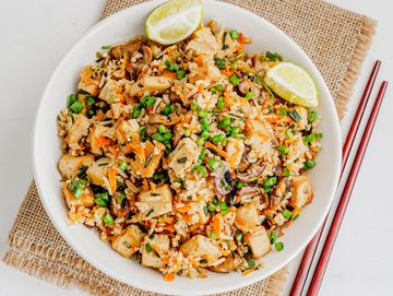 Basumathi rice, Spring Onion, Capsicum, Carrot, White Pepper, Soya Sorce, Butter, Chicken, Egg